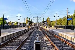 The station consists of two side platforms and six covered waiting areas; other amenities include ticket vending machines, emergency call box, and bicycle racks. The station also features several art installations including a drinking fountain basin designed to look like dogwood, the North Carolina state flower, by Nancy Blum.[9] Bas-reliefs entitled Hornbeam, by Alice Adams.[10] Leaf motifs on both the pavers and shelters, by Leticia Huerta.[11] River stone benches, by Hoss Haley, and track fencing with white oak leaves, by Shaun Cassidy.[12][13]