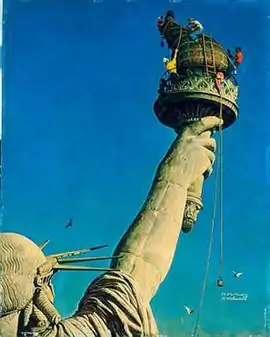 The painting was created for the cover of an edition of The Saturday Evening Post, published on 6 July 1946,[2] from sketches that Rockwell made in March 1946. It depicts the cleaning of the amber-coloured glass of the torch, an operation undertaken annually each July.[3] Rockwell focuses on just a small part of the Statue of Liberty – the torch, a 42 feet (13 m) long arm, and part of the head of the colossal statue, silhouetted against a clear summer blue sky. Five workmen are attached to the statue by ropes, including one who is a caricature of Rockwell himself, and one African-American in a red shirt. The inclusion of a non-white figure working with whites, apparently only noticed in 2011,[3] contravened a Saturday Evening Post policy of only showing people of ethnicity in subservient roles.[4]