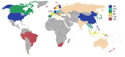 Best performances by nation (as of 2023). Not shown is Great Britain (Quarterfinals in 2019). The home nations of the United Kingdom competed separately in other editions.