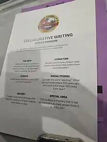 A Collaborative Writing prompt sheet in the Manila Global Round in 2019; students can choose one from the six subjects, however, each teammate must choose a different subject.