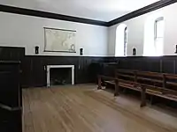 The Wren Building is the oldest extant building constructed for use by a college or university in the United States,[10][11] ahead of runner-up Massachusetts Hall at Harvard.[12] The Wren Building, previously known simply as "The College" or "The Main Building" was effectively the school's only academic building until the completion of the Brafferton building and President's House in the 1720s and 1730s. The campus only began its westward expansion in the first part of the twentieth century. Students studied, attended religious services, and lived in the Wren Building. In addition, at least eight students brought their enslaved people at the cost of room and board.[13] After the destruction of Virginia's former capital of Jamestown, Virginia's legislature met in the building's Great Hall as a temporary meeting place from 1700 to 1704 while the Capitol was under construction. In fact, the College was critical to Williamsburg becoming the new capital of Virginia after William & Mary students made speeches on May 1, 1699 from the College Building about how they would help build the town to its full potential.[14] When the Capitol burned in 1747, the legislature moved back into the building until the Capitol was reconstructed in 1754. The building also housed a grammar school and an Indian school, which was moved to the Brafferton building, in 1723. The building was used as a military hospital by the French during the American Revolutionary War and by the Confederacy during the American Civil War.