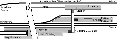 • Platform 3 can accommodate a 7 car train,[8] and was used for regular passenger services to London Marylebone via Shrewsbury, Telford Central and Tame Bridge, operated by Wrexham & Shropshire. This platform is now used by a small number of Borderlands Line passenger services (usually the first northbound and last southbound train each day), for services terminating at Wrexham from Shrewsbury and for freight services changing between the Shrewsbury-Chester line and the Borderlands line. This platform is signalled bidirectionally, so trains can depart either south towards Shrewsbury or north towards Bidston, although no services from Shrewsbury currently depart on the Borderlands line and vice versa. In practice this platform is used for trains terminating from either direction.