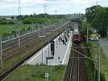 Wustermark station is a railway station in the town of Wustermark in the Havelland region of the German state of Brandenburg, to the west of Berlin. The station is located on the Berlin–Lehrte railway and is connected with the Jüterbog–Nauen railway (originally built as part of a freight bypass), part of which became part of the Berlin outer ring in the 1950s. It is classified by Deutsche Bahn as a category 5 station.[1]