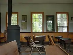The Wylie School is located in a rural setting, at the northern corner of Ekonk Hill Road (Connecticut Route 49) and Sandhill Road. It is a small single-story wood-frame structure with a gable roof and clapboarded exterior. Its main facade has two matching entrances, framed by simple molding and topped by a cornice. The interior has two vestibules with closets between them, leading into a single large schoolroom with a raised section at the back. The building's utilitarian appearance, which is largely devoid of period stylistic embellishments, was probably more typical of Connecticut's 19th-century district schools. The interior has been furnished to give the appearance it might have had in the 19th century, although the fixtures are not original. The property includes a period privy.[2]
