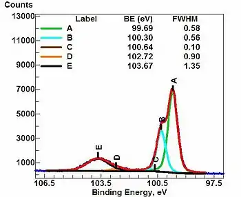 High-resolution spectrum of an oxidized silicon wafer in the energy range of the Si 2p signal. The raw data spectrum (red) is fitted with five components or chemical states, A through E. The more oxidized forms of Si (SiOx, x = 1-2) appear at higher binding energies in the broad feature centered at 103.67 eV. The so-called metallic form of silicon, which resides below an upper layer of oxidized silicon, exhibits a set of doublet peaks at 100.30 eV (Si 2p1/2) and 99.69 eV (Si 2p3/2). The fact that the metallic silicon signal can be seen "through" the overlayer of oxidized Si indicates that the silicon oxide layer is relatively thin (2-3 nm). Attenuation of XPS signals from deeper layers by overlayers is often used in XPS to estimate layer thicknesses and depths.