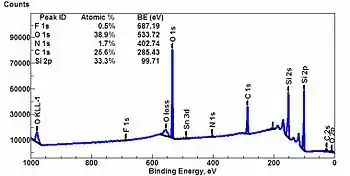 Wide-scan or survey spectrum of a somewhat dirty silicon wafer, showing all elements present. A survey spectrum is usually the starting point of most XPS analyses. It allows one to set up subsequent high-resolution XPS spectra acquisition. The inset shows a quantification table indicating the atomic species, their atomic percentages and characteristic binding energies.