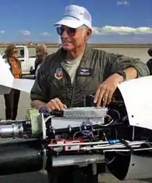 Dick Rutan standing next to the engines of the EZ-Rocket, after the official rollout flight, November 12, 2001