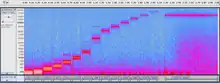 - 15 sinewave tones, all but the last 0.127 seconds in length (with 0.023 seconds of silence between tones), of the following estimated frequencies: 50, 100, 250, 400, 640, 1010, 1610, 4000, 6350, 8100, 10100, 12600, 15200, and 18300 Hz, followed by 130ms of silence then 820ms of a 15200 Hz tone.[4] (used by EMI Canada in 1982 as SDR)