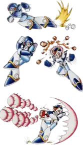 Hitoshi Ariga designed X's secret "Ultimate Armor" (アルティメットアーマー, Arutimetto Āmā) for the fourth title of the game, available only after inputting a cheat code, and for a corresponding Japanese Bandai action figure under the term "Mega Armor".[55] He was given four days to complete the design, and after finishing the design for the in-game parts, his supervisor told him to start over. After tinkering with the X3 Mega Armor parts, he noticed that attaching them in specific ways made them look like an airplane, which gave him the ideas he needed to complete the project. Ariga recalled creating the armor as a difficult yet fun task, and he revealed that Zero was intended to have a similar set of armor which did not get released at that time.[55] Artist Ryuji Higurashi designed X's new Falcon Armor (ファルコンアーマー, Farukon Āmā) for X5, wanting it to resemble a bird with a beak-shaped chest piece, wings coming out of the back, and a talon-like arm cannon. Suetsugu designed the Gaea Armor, which was meant to resemble Sanagiman from the Inazuman manga series.[45] In Mega Man X6, Suetsugu aimed to make the Blade and Shadow Armors look stylish.[56] Another armor based on the Ultimate's design was made for X to wear in Mega Man X Collection's "X Challenges" mode.[57] The three main characters were revised for Mega Man X8 as Yoshikawa wanted to give them more unique features to contrast their personalities.[58]