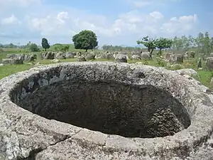 The province's most distinctive landmark is the Plain of Jars. The "jars" are 2,100 tubular-shaped megalithic stone jars used for funerary purposes. The jars range from 1–3 metres (3 ft 3 in – 9 ft 10 in) in height. They are found throughout the province in clusters containing from one to several hundred jars each. The jars date from the Iron Age (500 BCE–500 CE).[20] Nearest to Phonsavan is Jar Site 1, with an area of 25 hectares (ha). The largest jar found here is 2.5 m x 2.5 m, while the rest are half this size. One jar has decorations on it.[19][21] The megalithic jar sites of Xiangkhouang were inscribed on UNESCO's list of World Heritage Sites in July 2019.[20]
