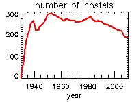 With peace, the resurgence of YHA continued until, in 1950, the peak number of hostels open was reached, with 303 open in that year.[11] Membership continued to grow and passed the 200,000 mark in 1950.[11] Overnight stays grew from 1.1 million in 1950 to 1.45 million in 1970.[12]