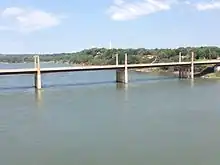 Yankton (right) along the Missouri River with the Meridian Bridge connecting Nebraska, looking west