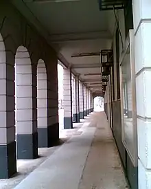 The neoclassical Main Block is built in Edwardian Free Style.[1] There is a traditional portico on both sides of Canton Road and Public Square Street.[3] The main entrance is a semi-circular portico set in the indented corner at the junction of Public Square Street and Canton Road. Such indented corners are features often used for feng shui reasons.[1]