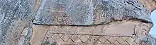 The most prominent feature of the site is the Midas Monument, a high rock-cut facade in the cliff face of the citadel.[5] The relief takes the form of a pedimented temple front with acroteria, and an abstract geometric design which appears to imitate the terra cotta facings of buildings. There is a niche at the bottom center, with walls bearing graffiti that read MATAR (Mother, i.e. the goddess Cybele) and it probably held a statue of Cybele.[6]