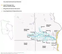 The Yellow River is a 53.5-mile-long (86.1 km)[2] tributary of the Mississippi River in northeastern Iowa. It originates in southwestern Winneshiek County and flows through southern Allamakee County, receiving tributaries from northern Clayton County, before joining the Mississippi near Marquette and Effigy Mounds National Monument.