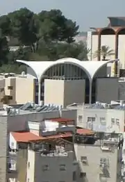 The yeshiva building with its designed roof