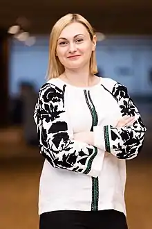 Yevheniya Kravchuk (Ukrainian: Євгенія Михайлівна Кравчук; 23 December 1985, Ternopil, Ukrainian SSR) is a Ukrainian politician, journalist and communication expert. She heads the press office of the Servant of the People political party. Kravchuk was elected to the Verkhovna Rada in 2019. She is Deputy Chairman of the Committee on Humanitarian and Information Policy since August 29, 2019.[2][3]