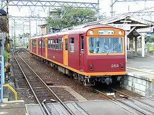 The line was originally built as a tram utilising a track gauge of 762mm, which was relatively common at that time for such local lines. Later on the legal classification of the line was changed from a tram to a light rail, however the gauge was not widened, unlike the majority of 762mm gauge lines. Today, there are only four 762 mm (2 ft 6 in) gauge railway lines in operation in Japan.