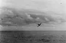 A P1Y1 under attack by United States Navy aircraft and anti-aircraft guns.