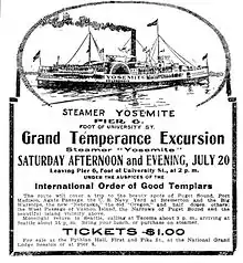 Boxing matches were held on her lower deck.[4] Perhaps somewhat incongruously with hosting boxing matches, Yosemite on July 20, 1907 or 1908, advertised a "Grand Temperance Excursion" tickets $1.00 each "under the auspices of the International Order of Good Templars":