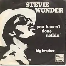 "You Haven't Done Nothin" is a 1974 funk single by Stevie Wonder, taken from his album Fulfillingness' First Finale and featuring background vocals by the Jackson 5. The politically aware song became Wonder's fourth Number 1 pop hit and his tenth Number 1 soul hit.[2] It also reached Number 1 in Canada.[3] In the UK the single spent five weeks on the chart, peaking at Number 30.[4]