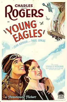 Young Eagles is a 1930 American pre-Code romantic drama film directed by William A. Wellman for Paramount Pictures. It stars Charles "Buddy" Rogers, Jean Arthur, and Paul Lukas. The story is based on the stories "The One Who Was Clever" and "Sky-High", written by American aviator and war hero Elliott White Springs.[1] The film's hero is a "heroic combat aviator of the Lafayette Escadrille".[2]