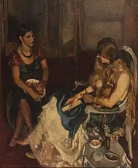 Young Girls is a portrait painting in oil on canvas, which measures 133 cm by 164 cm.[6] Set in an affluent home, it depicts two similarly aged women sat on chairs in close proximity.[4][7] The dark woman, modelled by Sher-Gil's sister Indira, is positioned upright and appears to have a smirk.[4][8] Her attire is western and neat, and her hair combed back.[7][9] In her lap are some cherries.[10] The light skin woman, modelled by a friend, Denise Proutaux, is slouched, with her blonde hair partially covering a naked breast.[4] Her right foot is shown bare.[11] They face each other, appearing to be in conversation.[4] There is a half-closed cupboard in the background.[11]