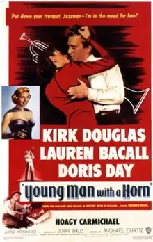Young Man with a Horn is a 1950 American musical drama film starring Kirk Douglas, Lauren Bacall, Doris Day, Hoagy Carmichael, and Juano Hernandez.[2][3] Directed by Michael Curtiz, it was based on the 1938 novel of the same name by Dorothy Baker inspired by the life of jazz cornetist Bix Beiderbecke. The film was produced by Jerry Wald, and its screenplay written by Carl Foreman and Edmund H. North.