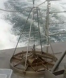 The Young grab, or the Young modified Van Veen grab sampler is an instrument to sample sediment in the ocean. It is a modified version of the Van Veen grab sampler, with a clamshell bucket made out of stainless steel mounted to a supporting frame. The sampling area extracted with this instrument can vary depending on its size. With the modifications this version of the Van Veen grab sampler is heavier than the traditional version. The frame allows for better stability and level sampling. Weights can be attached to the frame to ensure the bucket grabs sufficient sediment, or skids to ensure the gear does not sink too deep in soft sediments.[1][2]
