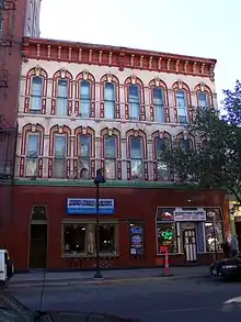 The Youngerman Block is a three-story masonry structure abutting the NRHP-listed Randolph Hotel, which lies to its south on 4th Street. The ground floor is arranged as two retail tenant spaces fronting on the street. The southern unit, 206 4th Street, is 67 feet (20 m) deep, while the northern unit, 208, is 78 feet (24 m) deep. Upper levels vary in size, with three stories over 208, but the rearmost 20 feet (6.1 m) of 206 only one story. The upper levels are faced with "asbestine" made by Youngerman's manufacturing operation, all presently painted gray. The upper levels are dominated by arched windows with prominent, intricately detailed surrounds, more elaborate on the third floor. The top of the facade is ornamented by a pressed metal cornice. Larger brackets at each end and in the middle help to define the building's two primary bays. The upper two floors on the street side feature eight tall, narrow arched windows with flattened tops on each level.[2]