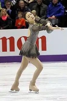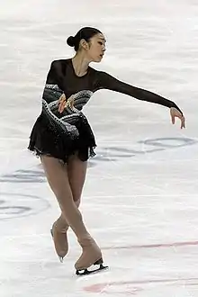 Kim began skating at the age of five, at a neighborhood rink with her sister.[11] Ryu Jong-hyun, a former ice dancer, coached Kim between the ages of 7 and 10 and Shin Hea-sook, who competed for South Korea at the 1980 Olympics, coached Kim between the ages of 10 and 12 years old. Kim later said that Ryu and Shin both helped her, from the start of her skating career, to become who she was both technically and spiritually.[18] Ryu suggested to Kim's mother, who noticed early on that there was something special about her daughter's skating, that Kim receive formal training in figure skating.[5][19][11] In a 2011 interview, she gave credit to her coaches for noticing and developing her aptitude for skating, stating that they told her that her body was perfect for skating. She added, "I was born with a good instrument, maybe more so than the talent".[6] Ryu cited Kim's work ethic, especially her hard work, dedication, and commitment to practice, for Kim's success.[19] She landed her first triple toe loop at the age of 10 and except for the triple Axel, was able to land every triple jump cleanly two years later.[4] During her middle school years, her boots often did not fit her as she matured, and she had many injuries, including a period when she had to rest for a month after a pelvic-muscle injury.[20]