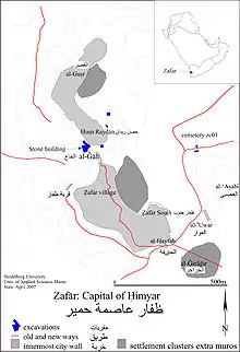 Ẓafār (Arabic: ظفار), also called Dhafar, is an ancient Himyarite site situated in Yemen, some 130 km south-south-east of today's capital, Sana'a, and c. 10 kilometres (6.2 mi) southeast of Yarim. Given mention in several ancient texts, there is little doubt about the pronunciation of the name.[1] Despite the opinion of local patriots in Oman, this site in Yemen is far older than its namesake there.[2] It lies in the Yemeni highlands at some 2800 m. Zafar was the capital of the Himyarites (110 BCE – 525 CE), which at its peak ruled most of the Arabian Peninsula.[3] For 250 years the tribal confederacy and allies' combined territory extended past Riyadh to the north and the Euphrates to the north-east.