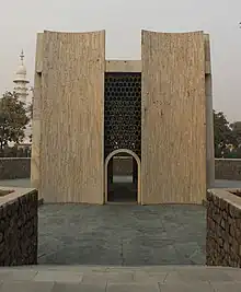 Husain's tomb was built in 1971 and was designed by Habib Rahman.[123] Its architecture reflects the influence of Bauhaus aesthetics on traditional Indian styles as seen in its eight curved, reinforced concrete walls topped by rough cut marble which have been inspired by Tughluq tombs.[124] These tapering walls stand along a square plan to form an open structure topped by a shallow dome. The tomb has no ornamentation but features jalis and arches. The graves of Husain and his wife lie under the dome of the tomb.[125][126]