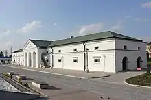 In September 1939, after the outbreak of World War II, German Luftwaffe planes bombed Zamość several times. Over 250 people were killed, mainly civilians.[5][6] In early September 1939, the Polish government evacuated a portion of the Polish gold reserve from Warsaw to Zamość, and then further southeast to Śniatyn at the Poland-Romania border, from where it was transported via Romania and Turkey to territory controlled by Polish-allied France.[7] The city was overrun by the Germans during the invasion of Poland and the local garrison, staffed by the Polish infantry regiment of podpułkownik Stanisław Gumowski, was defeated.[5] On September 27, 1939, Nazi Germany signed a border treaty with the Soviet Union which had invaded Poland from the east, and, consequently, on September 28, 1939, Zamość was handed over to the Red Army – for about a week. The Soviets withdrew on October 5, 1939, along with some 5,000 Jews after a further demarcation line adjustment. The Germans returned to the city on October 8, 1939[5] and shortly afterwards mass arrests of prominent citizens began. This was as part of the secret A-B Action, the deliberate extermination of Polish intellectuals. The German Nazis created an execution site in the Zamość Rotunda, Gestapo camp, (in German: Gefangenen-Durchgangslager Sicherheitspol, in English: "The transit camp for Security Police prisoners").[5] More than 8,000 people were massacred there, including displaced residents of the region. In Zamość, Nazi Germans also created a "Transit Camp" on Okrzei Street,[8] for arrested and displaced inhabitants of the Zamość region (including thousands of children)[5][9] and camps[5] of Soviet prisoners of war captured during Operation Barbarossa.[5]