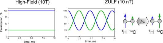 The thermal equilibrium state of a 1H-13C pair in high-field corresponds to a state in which both spins are polarized along the B0 field, with 1H polarization about 4 times higher than that of 13C spins. This is a stationary state at high field. If the field is non-adiabatically (rapidly) switched off, the state starts to evolve. The polarization oscillates between the 1H and 13C spins at the J-coupling frequency (210 Hz in this example), and this gives rise to J-spectra in ZULF NMR.