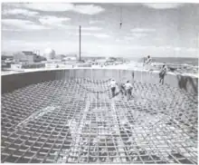Taken in August, 1967, before the erection of the backup containment structure, this picture shows the network of 80 cables that support the sand and gravel roof over the ZPPR reactor cell