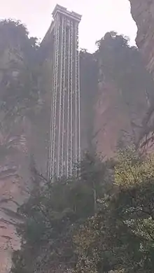 The Bailong Elevator, literally "hundred dragons sky lift", was opened to the public in 2002. At 326 m (1,070 ft), it is the world's tallest outdoor lift. It can transport visitors to the top from its foot in less than two minutes. The structure is composed of three separate glass elevators, each of which can carry up to 50 people at a time.[6]
