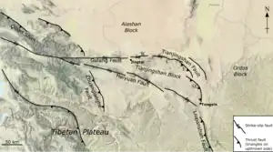 The Zhongwei-Tongxin fault is one of the structures that accommodates the eastward spreading of the thickened crust of the Tibetan Plateau, the result of the ongoing collision between the Indian Plate and the Eurasian Plate. The northeastern margin of the Tibetan Plateau is marked by a combination of sinistral (left-lateral) strike-slip faults and thrust faults. The largest of the strike-slip faults is the 1,000 km long WNW–ESE trending Haiyan fault, which links to the east with the northern end of the Liupanshan Fault zone, a fold and thrust belt that accommodates the eastward motion of the plateau against the Ordos Block.[3] To the north of the western part of the Haiyuan Fault, the northern boundary of the Qilian Shan is formed by WNW–ESE trending thrust faults of the Hexi Corridor. Near Gulang, the Haiyuan Fault splays onto the west–east trending Gulang Fault, which continues to the east as the four segments of the Zhongwei-Tongxin fault.[4]