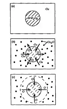 While complex oxides containing Cu, Zr, and W were believed to be created, selected area diffraction (SAD) of the ceramic product has proven the existence of Cu2O as precipitates after reaction. A model consisted of two concurrent processes were surmised (as presented): (b) the decomposition of the ceramic and loss of oxygen under low oxygen partial pressure at high temperature leads to Cu2O formation; (c) copper diffuses into the ceramic and forms new oxides that absorb some oxygen upon cooling.