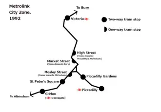 The current Metrolink system started operation in 1992. The first Metrolink routes through the city-centre were designed to link Victoria and Piccadilly stations, as well as integrating the converted Bury Line (Bury-Victoria) and Altrincham Line (Altrincham-Piccadilly) into a single network.[8] The first phase city-centre routes, consisted of a 1.9-mile (3.1 km) street-running route from Victoria, via Market Street to G-Mex (now known as Deansgate-Castlefield) where it joined the line to Altrincham Interchange: This is now known as the first cross city route (1CC). Also a 0.4-mile (0.7 km) branch to Piccadilly, which diverges at a three-way junction (known as a 'delta junction') at Piccadilly Gardens.[1]