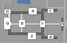 Close to the entrance on the eastern side of the complex, the following buildings have been renovated recently: the bathhouse (浴室, yokushitsu) (Y) and the toilet (七間浄頭, shichiken chinjū) (N).[A 6]