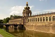 The Zwinger (German: Dresdner Zwinger, IPA: [ˈdʁeːzdnɐ ˈt͡svɪŋɐ]) is a palatial complex with gardens in Dresden, Germany. Designed by architect Matthäus Daniel Pöppelmann, it is one of the most important buildings of the Baroque period in Germany. Along with the Frauenkirche, the Zwinger is the most famous architectural monument of Dresden.