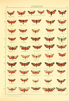depicting a few subspecies]] Z. carniolica Scopoli, 1763] the spots of the forewing are confluent in pairs ; Liguria.— In ab. jurassica Blachier [ now Zygaena carniolica ssp. virginea Müller, 1766] the central spots are very large and connected with the red basal area by a costal streak, while the 6 spot remains isolated; found near Geneva in July and August. — ab. weileri Stgr. (= diniensis Oberth.) [ now Zygaena carniolica ssp. modesta Burgeff, 1914] . Here the proximal spots are merged to a large red patch which bears single red dots, only the 6 (lunate) spot remaining separate; in Germany, Austria and at the Riviera. — ab. ragonoti Gianelli (8f) [now Zygaena carniolica ssp. virginea Müller, 1766 ] from Turin, is only a modification of the form weileri ; the forewing is almost entirely red, but, besides the 6 spot being isolated, there are some more black markings in the basal area of the forewing than in weileri. — In the Tring Museum there is an aberration with entirely red wings, which may be named totirubra ab. nov. [now junior synonym of Zygaena carniolica Scopoli, 1763] (8f), since the corresponding forms of other species of Zygaena have received names. Found in Hungary.— In amoena Stgr. [now junior synonym of Zygaena carniolica Scopoli, 1763 ] (8ef), from Hungary and Lower Austria, the whitish edges of the spots of the forewing are so enlarged that the white almost entirely displaces the dark ground-colour, the hindwing being sometimes pale pink, as in the third specimen figured as (amoena on 8f.) — In berolinensis Stgr. [ Zygaena carniolica ssp. berolinensis Lederer, 1853 ] (8g), occurring singly everywhere among the normal form, but being especially typical at the Italian Riviera, the white margins of the spots of the forewing are completely absent and the abdomen is without belt. — As taurica Stgr.[ Zygaena carniolica ssp. taurica Staudinger, 1879 ] (8g) a Lydian form is known in which the proximal spots are broadly white-edged, while the 6 transverse, spot has almost disappeared. — In apenina Tur. (= wiskotti Calb.) [ now Z. carniolica ssp. hedysari Hübner, 1796 ] (8g), which flies not rarely near Genoa behind the Campo Santo among hedysari and berolinensis, the 6 transverse spot is completely absent or is only indicated as a dull shadow in the ground colour.- graeca Stgr. [ Z. carniolica ssp. graeca Staudinger, 1870] resembles a small carniolica of the name-typical form, and has like this insect a red belt, but the whitish yellow edges of the spots of the forewing are much thinner; from Greece.amasina Stgr. (8j) [Zygaena carniolica ssp. amasina Staudinger, 1879 ], from Asia Minor, closely resembles amoena but is beautifully bright-red instead of pink and has abundant traces of the black ground colour, which in amoena is almost entirely replaced by white.wiedemanni Men. [ Z. carniolica ssp. wiedemannii Ménétriés, 1839 ] (8h), from Anterior Asia, on the contrary has so much white on the forewing that this is the prevalent colour: moreover, the abdomen is vermilion except the base and tip.— albarracina Stgr. [ Z. carniolica ssp. albarracina Staudinger, 1887, from Andalusia, is a small form which approaches orana, but has less red on the abdomen.In transiens Stgr. [ Z. carniolica ssp. transiens Staudinger, 1887 ] the spot 6 which is edged with white in the previous forms, has become all white, the red centre disappearing, this form therefore approaching the occitanica group, which one has several times endeavoured to distinguish specifically from the carniolica-forms from Western Asia.[6]